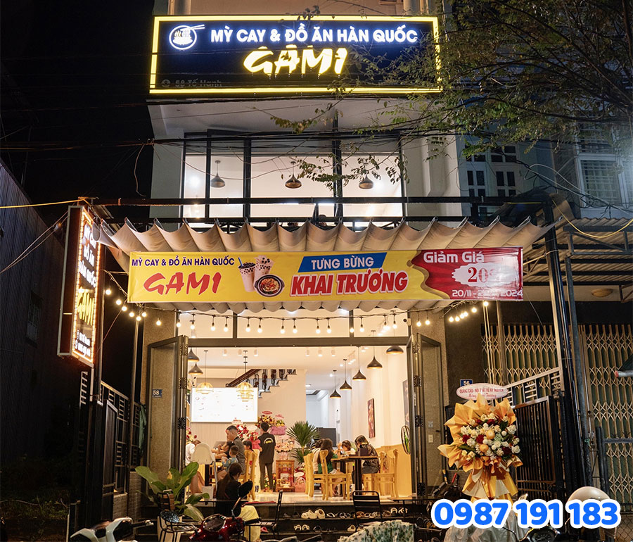 • Bảng hiệu là công cụ giúp truyền tải nhanh thông điệp mà cửa hàng muốn hướng đến như: món chính (mì cay Hàn Quốc, mì cay hải sản…), phong cách quán.